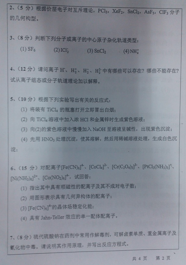 武汉大学2012年无机化学和高分子化学与物理C卷651半岛在线注册真题(2)