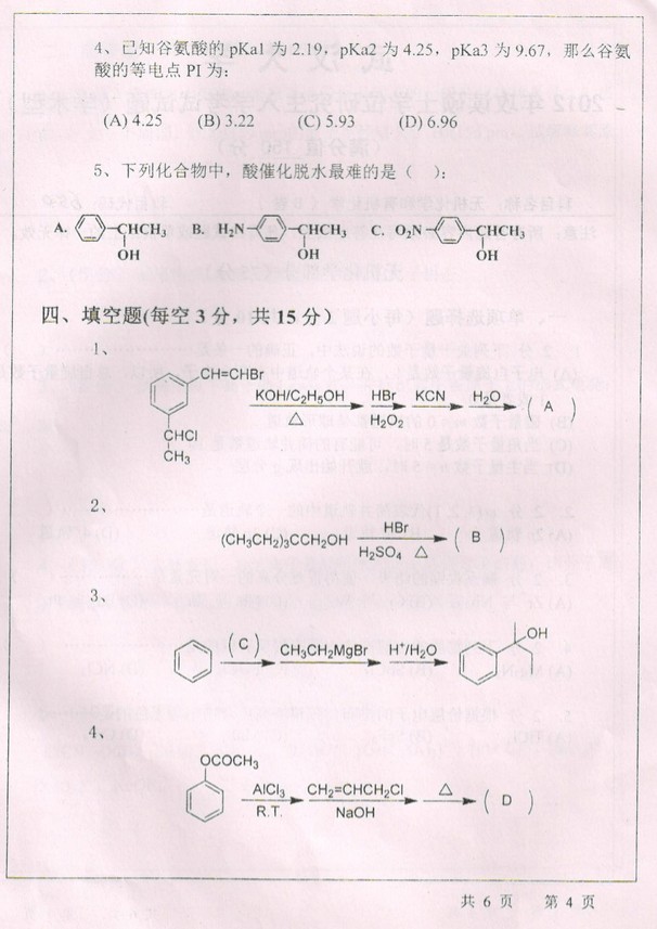 武汉大学2012年无机化学和有机化学B卷650半岛在线注册真题(4)