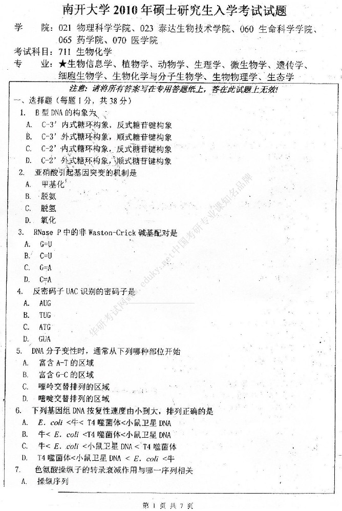 南开大学2011-2010,2006-2004生物化学711半岛在线注册真题
