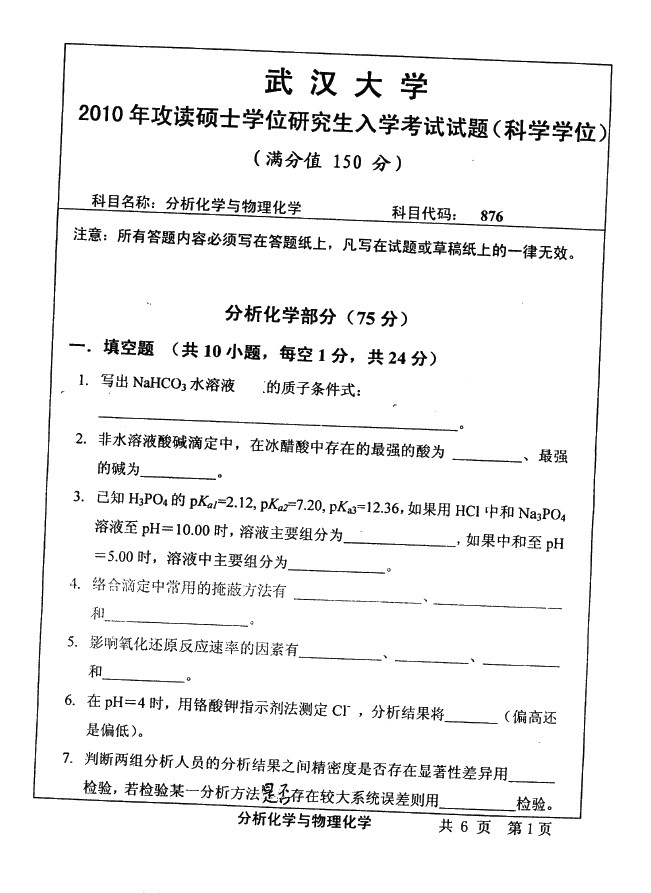 武汉大学2011-2010分析化学与物理化学882半岛在线注册真题
