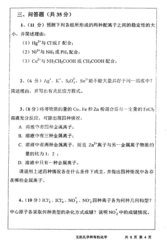 武汉大学2011-2010无机化学和有机化学636半岛在线注册真题(4)