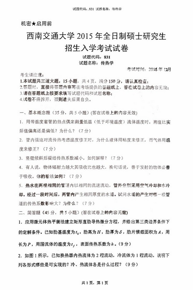 2015年西南交通大学传热学831半岛在线注册真题