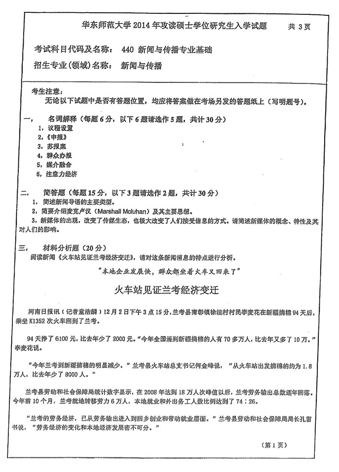 2014年华东师范大学440新闻与传播专业基础半岛在线注册真题