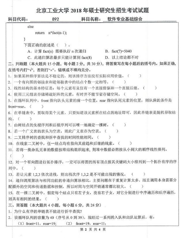 北京工业大学2018年892软件专业基础综合硕士试题(2)
