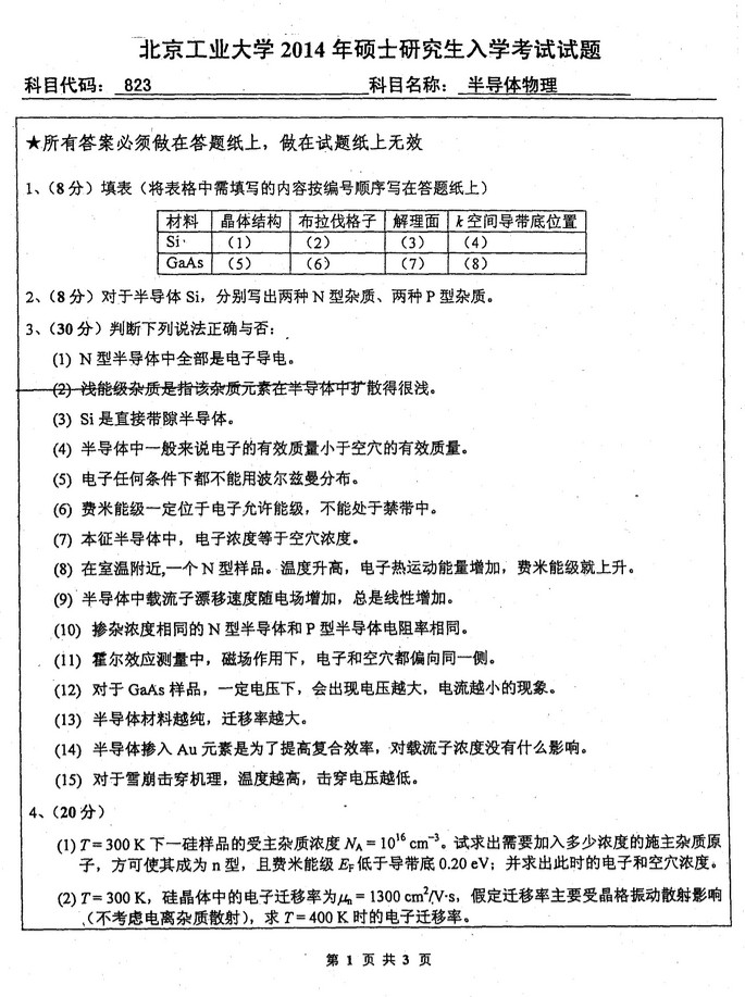 2014年北京工业大学823半导体物理半岛在线注册真题
