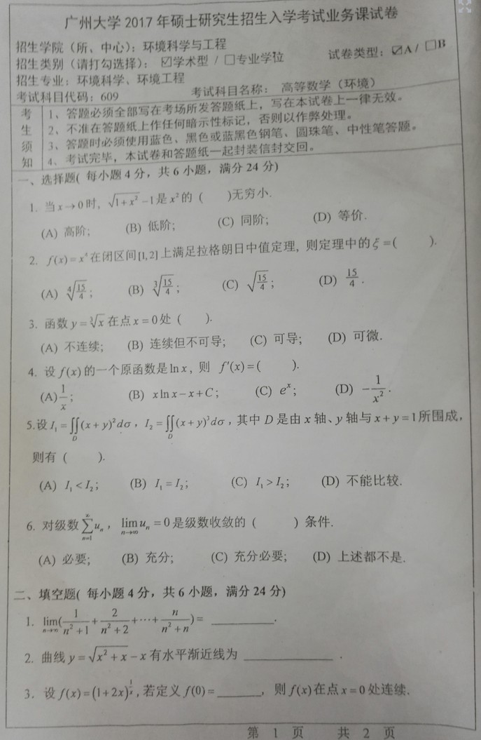 2017广州大学609高等数学(环境)半岛在线注册专业课真题