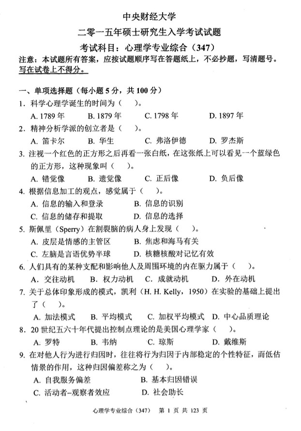 2015年中央财经大学347心理学专业综合半岛在线注册真题