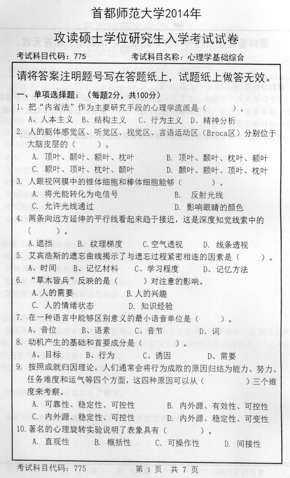 2014年首都师范大学心理学基础综合半岛在线注册真题