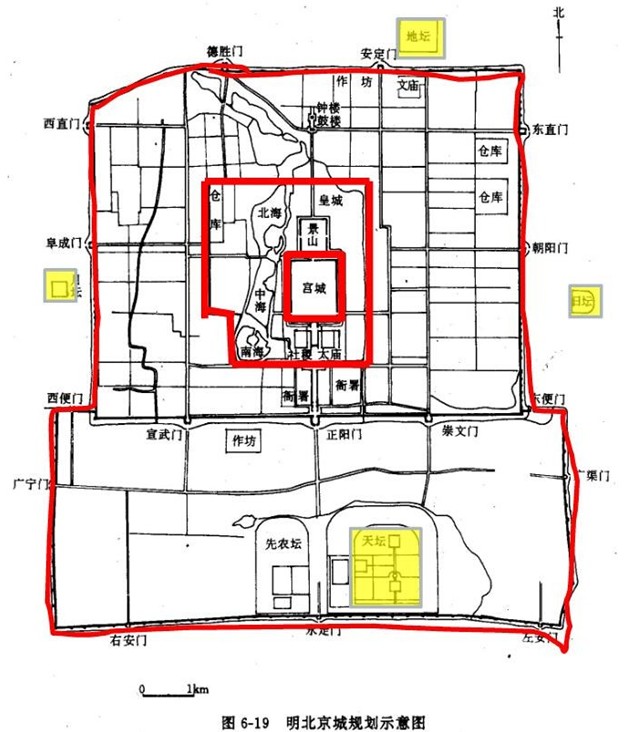 京城、皇城、宫城三重,整个以宫城为中心,皇城前左建太庙,右建社稷坛, 并在城外四方建天地日月四坛。玄武门外建内市。符合“左祖右社、前朝后寝” 的城制;