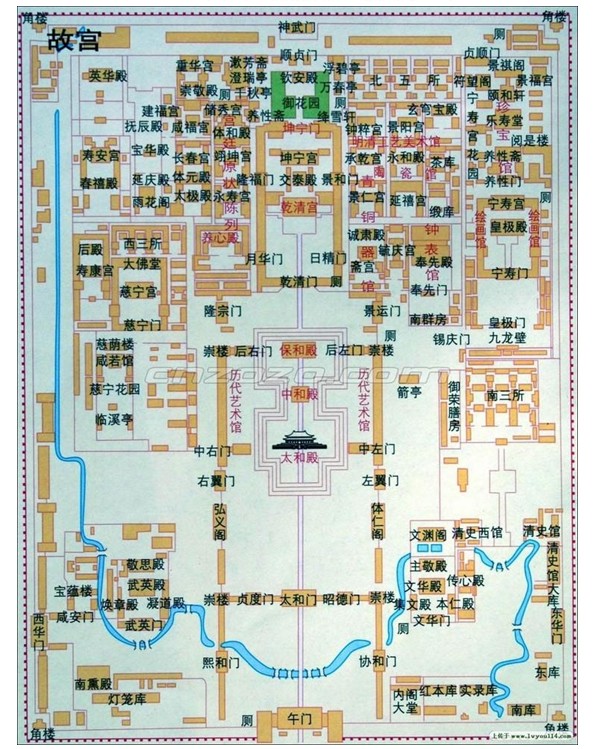 8 公里中轴线:永定门(外城门)——正阳门(内城门)——中华门——天安门(皇城前门)——端门——午门(宫城前门)——太和门——前三殿——乾清门——后寝三殿——坤宁门——景山、后花园——玄武门——地安门(皇城后门)——钟鼓楼;