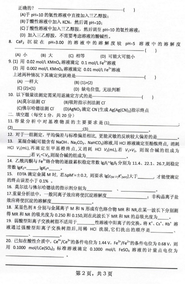判断题10道,10分。可能没复习好,没挑出错来,感觉都对。记得有滴定盐酸的基准物质 是草酸钠,吸光光度法测铁用铁空心阴极灯,原子发射外标法应用最广