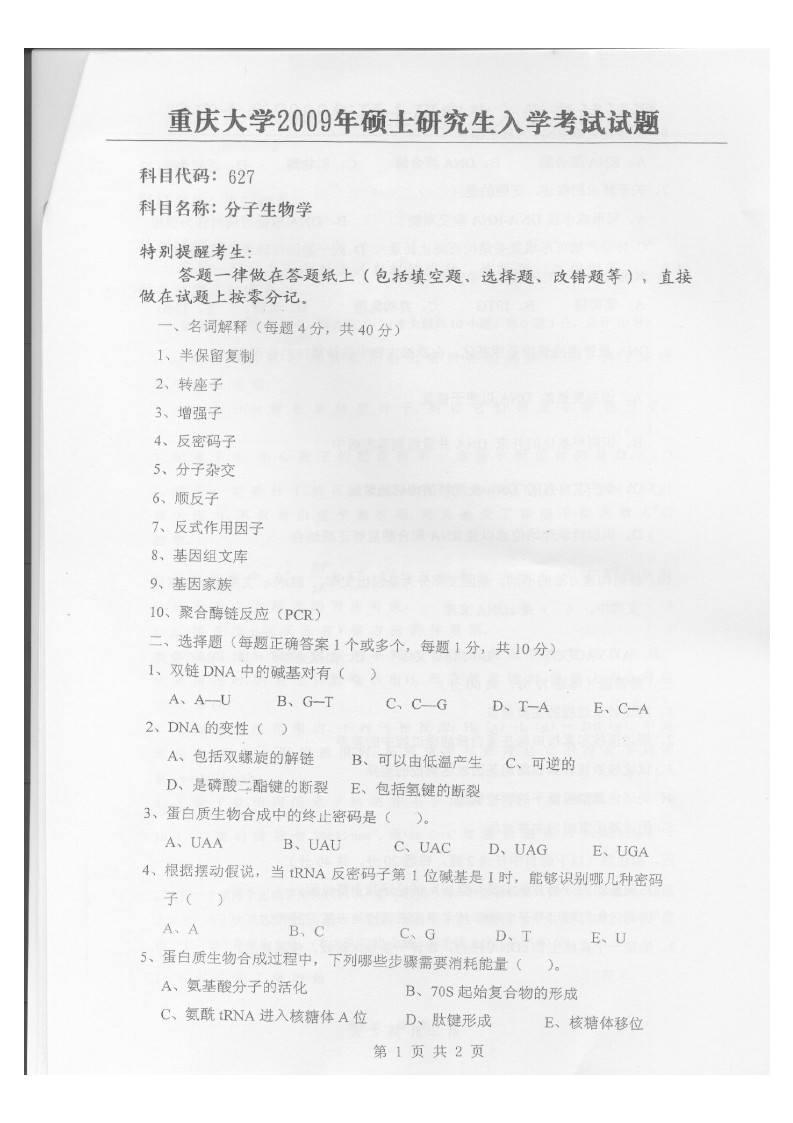 2003-2014重庆大学分子生物学历年半岛在线注册真题(10)