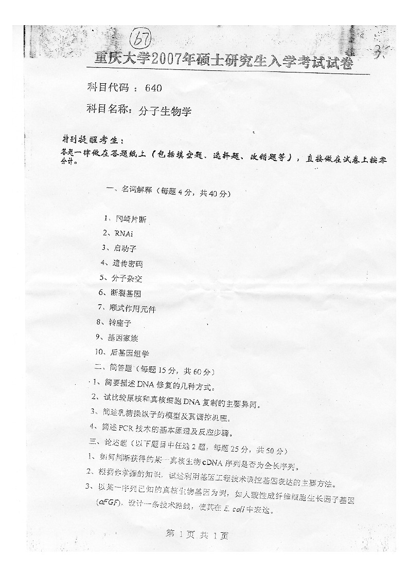 2003-2014重庆大学分子生物学历年半岛在线注册真题(8)