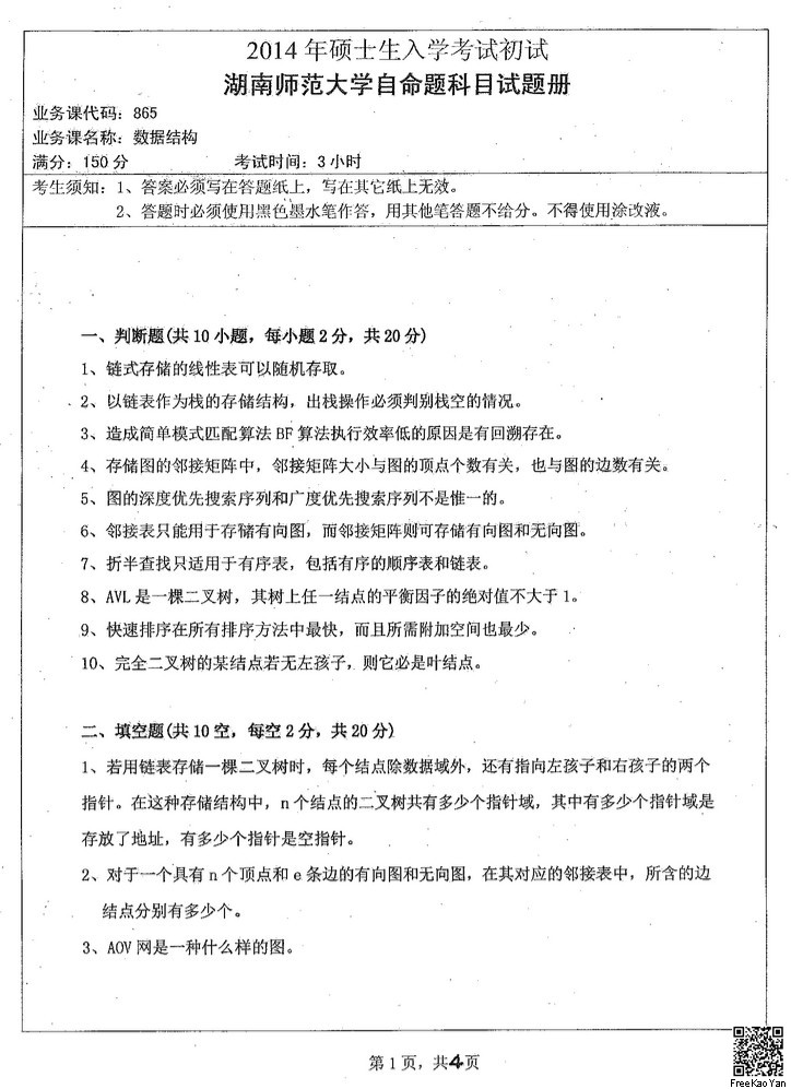 2014年湖南师范大学865数据结构半岛在线注册真题
