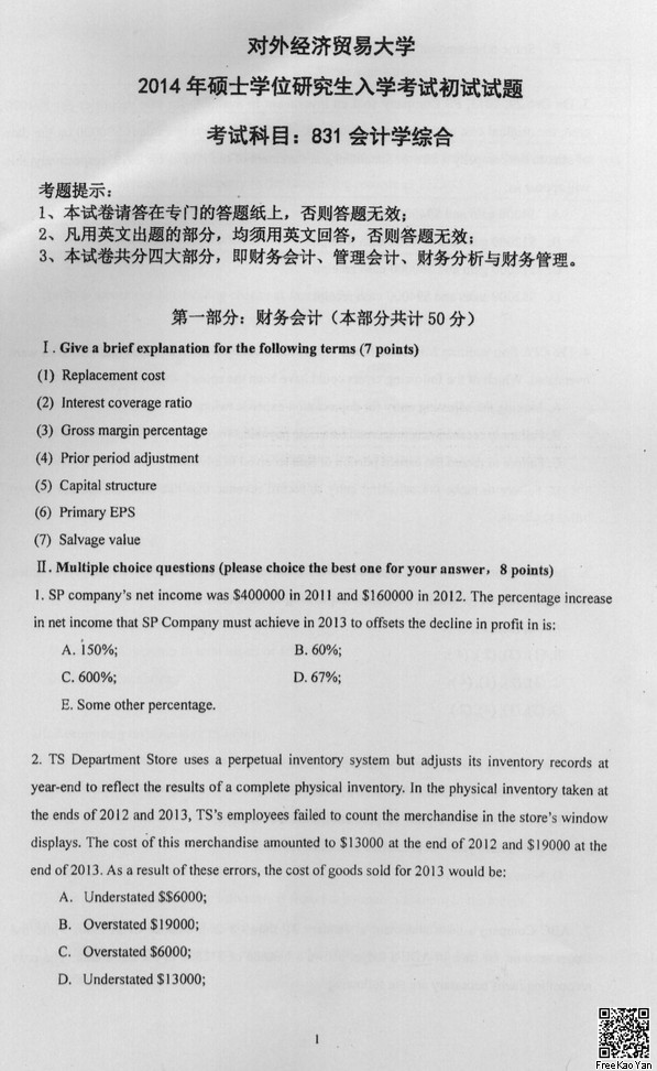 2014年对外经济贸易大学会计学综合831半岛在线注册真题