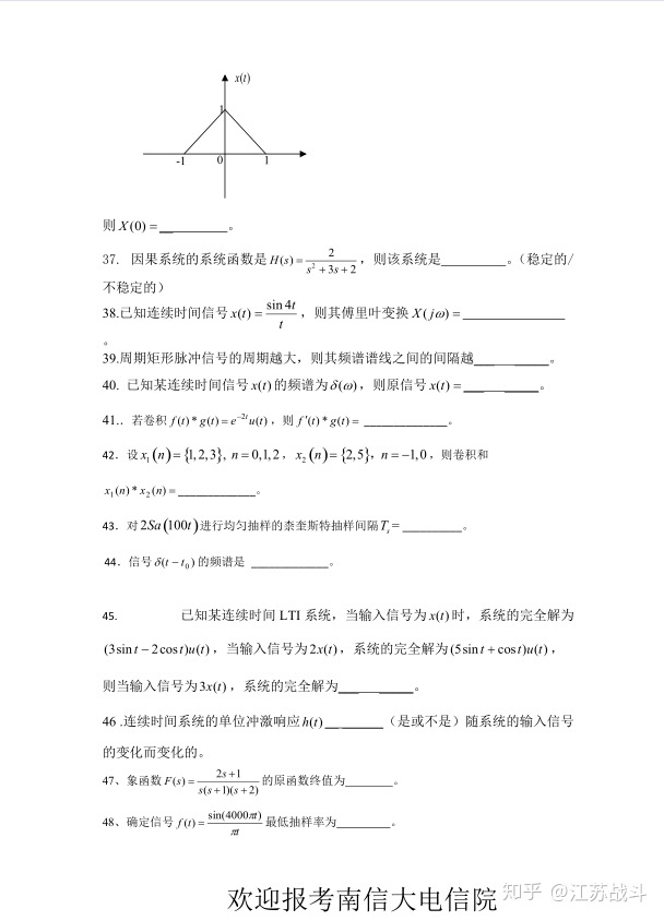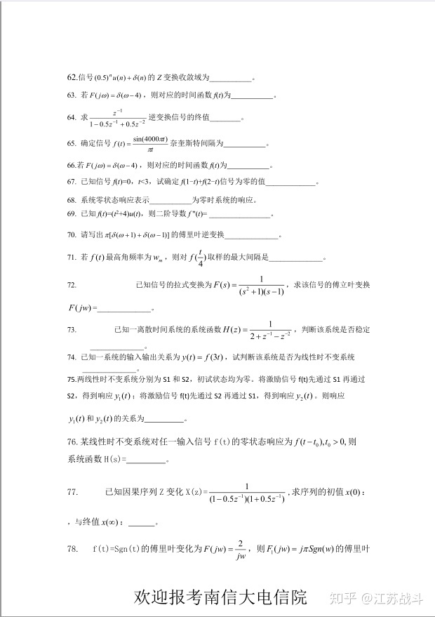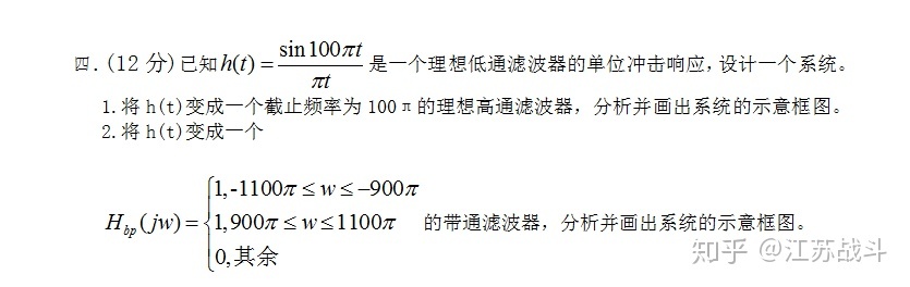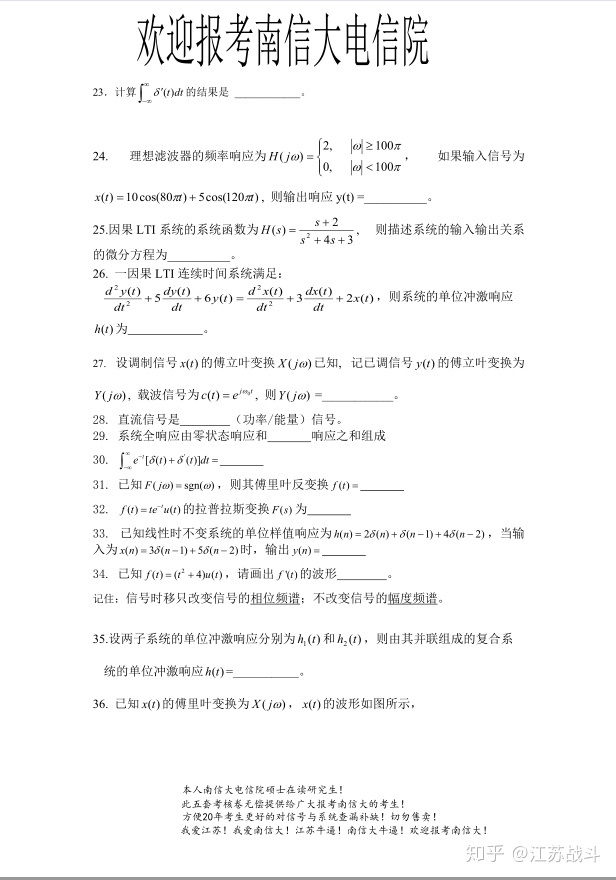 像下面这些设计系统题目!拿到题目不要慌!你不会你的竞争对手也不太会!试着从下面几个角度去考虑:1.信号与系统想考无非就是三大变最难的就是傅里叶变化!2.拉斯变化稳定看H(s)3.z变化稳定看单位圆4.要从题干的知识点中能得到一些什么:举个简单的例子题干告诉你g(t)能干嘛?只能求h(t),h(t)能干嘛,的确不能干嘛,但是让你一个系统,那肯定要稳定h(t)能转化H(s),题目就游刃而解了!5.就算你真的不会写,连续时域你用拉斯变化,时域卷积,甚至傅里叶变化!离散时域用z变化!千万不要空!千万不用空!千万不要空!