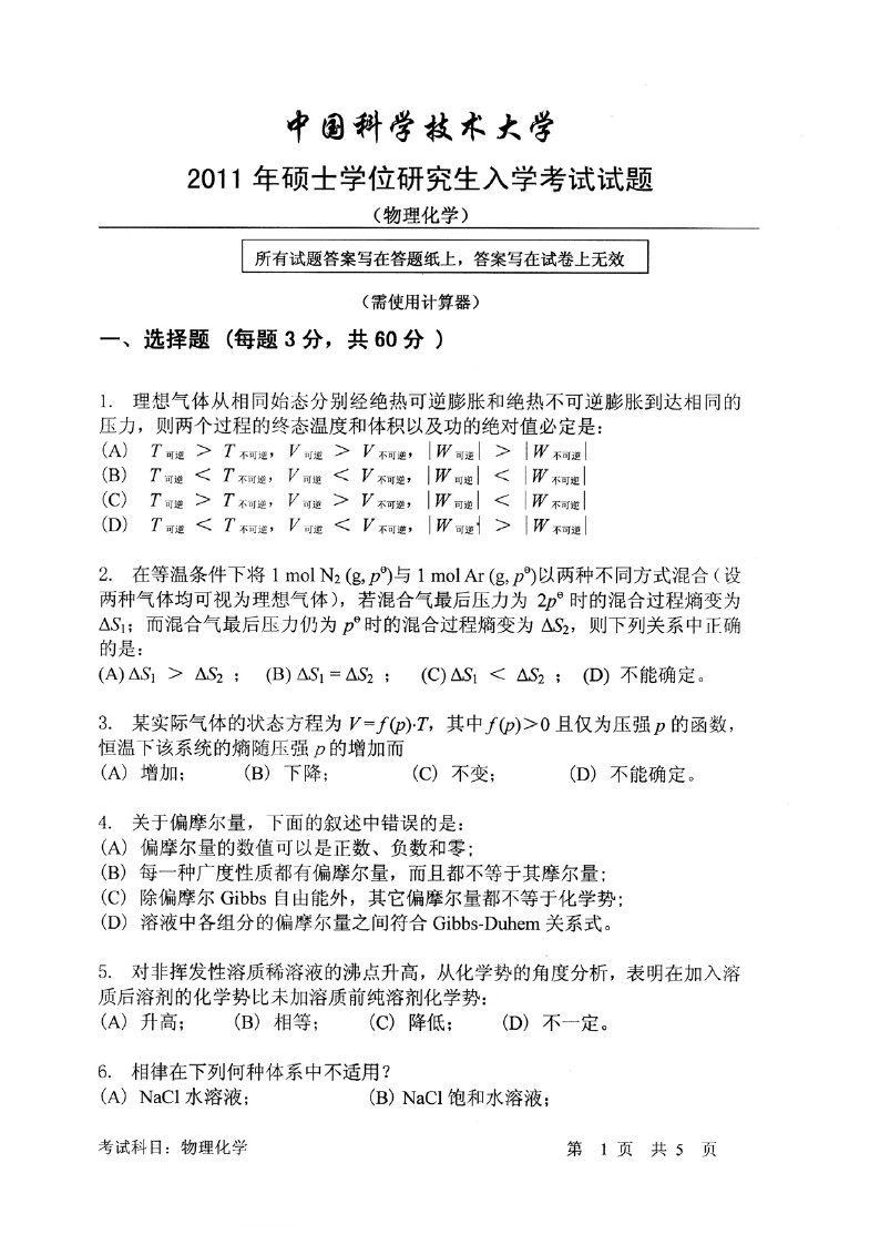 中国科学技术大学2016-2011物理化学半岛在线注册真题和答案(40)