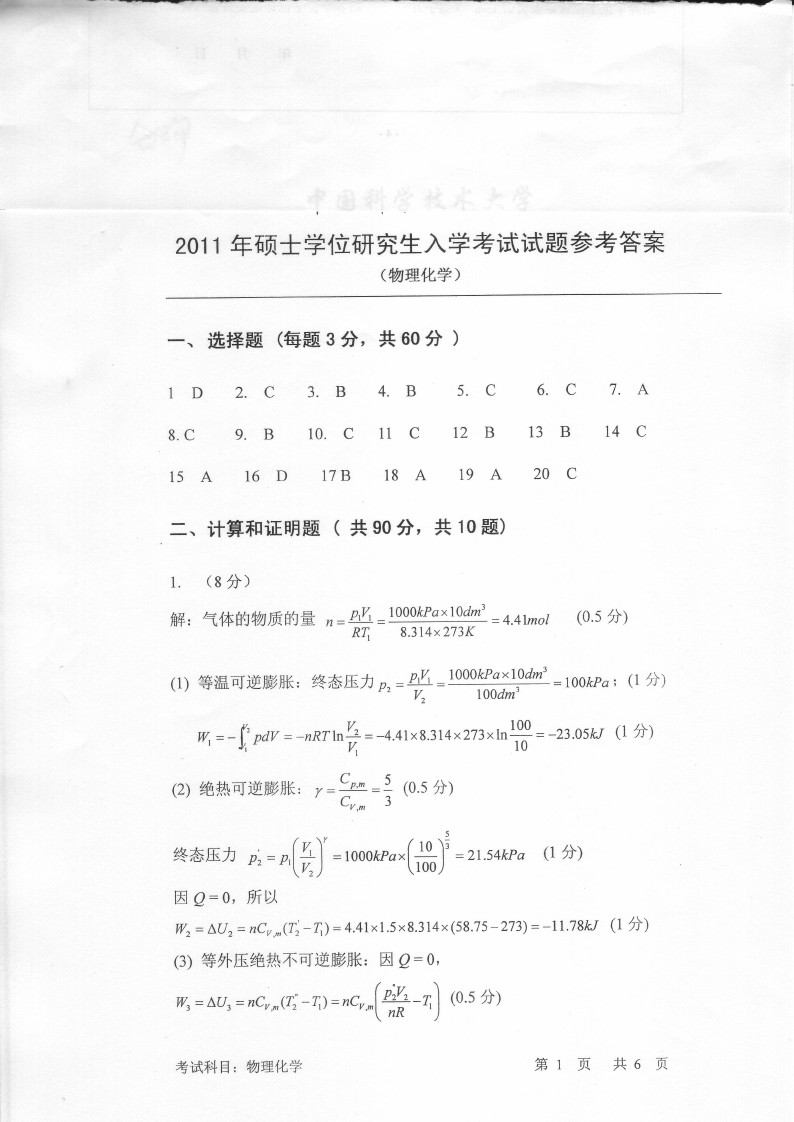 中国科学技术大学2016-2011物理化学半岛在线注册真题和答案(45)