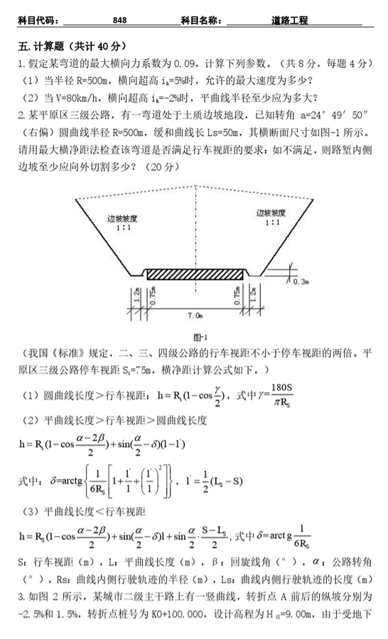 科目代码:848 科目名称:道路工程 北京工业大学2007年硕士研究生入学考试试题 一、简要解释下列名词(共计20分,每个名词解释2分) 1、设计车速 2、道路红线 3、横向力系数 4、缓和曲线 5、爬坡车道 6、纸上定线 7、山脊线 8、路基工作区 9、道路材料劳寿命 10、湿克勒地基模型 二、空题 ...