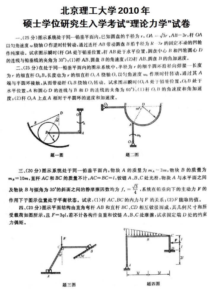 2010北京理工大学848理论力学半岛在线注册真题