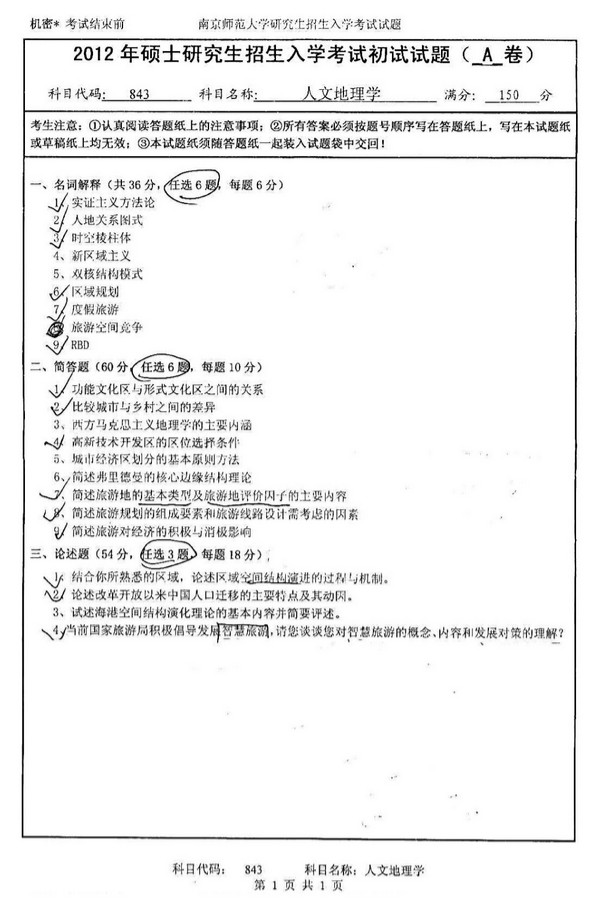 南京师范大学地理科学学院人文地理学历年半岛在线注册真题汇编(7)
