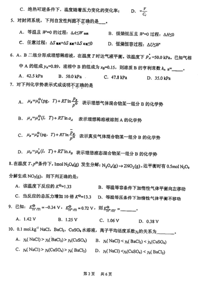 北京化工大学2013半岛在线注册物理化学试题(2)