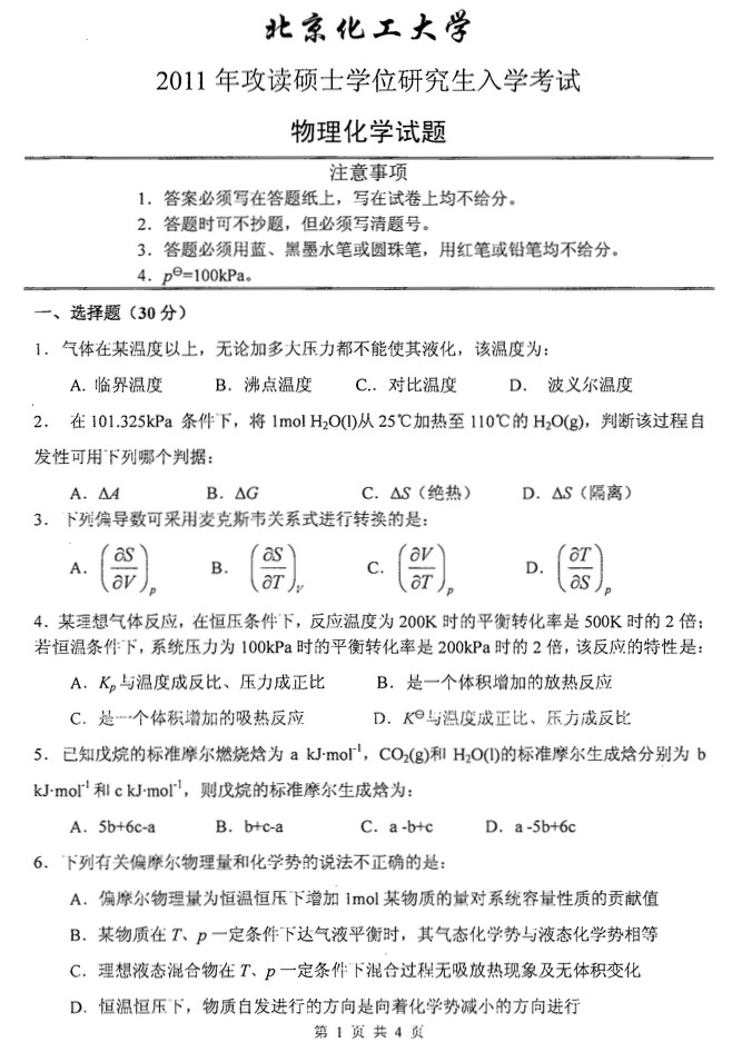 北京化工大学2011半岛在线注册物理化学试题