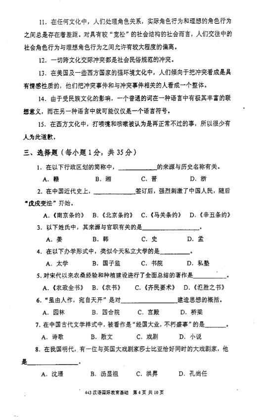 2010年厦门大学汉语国际教育基础半岛在线注册试题(4)