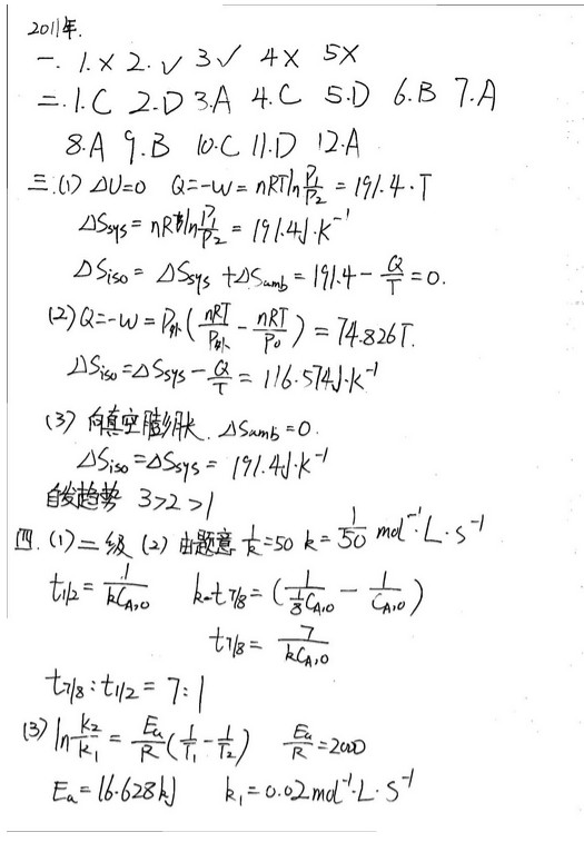 北京航空航天大学2011-2013年物理化学半岛在线注册真题 答案(4)