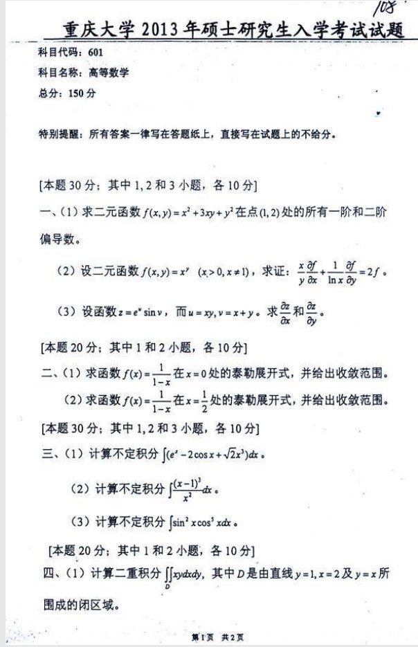 重庆大学物理学院601高等数学历年半岛在线注册真题汇编(4)