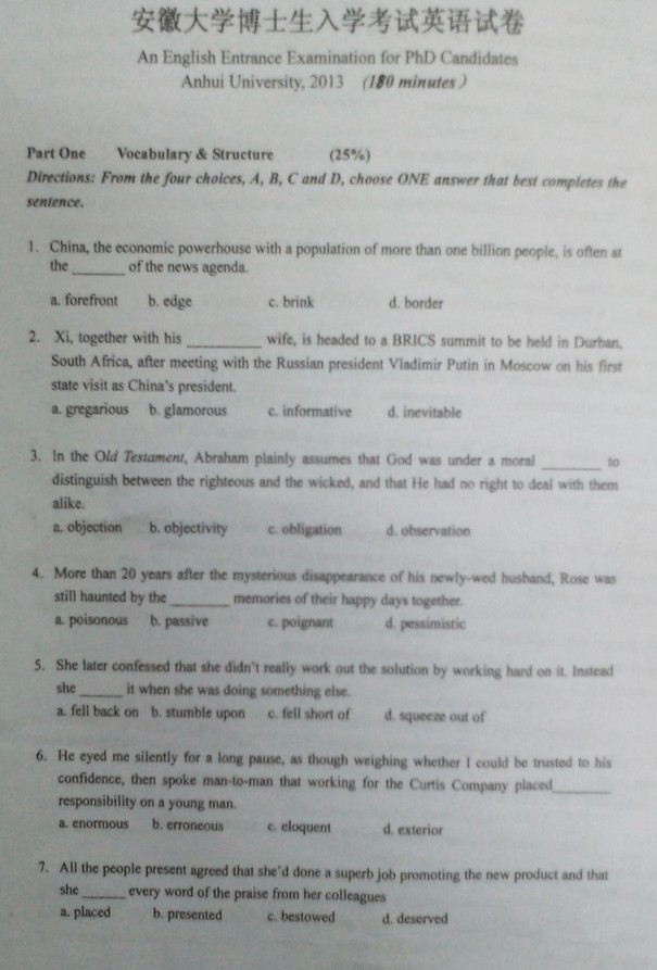 基础英语一.选择题(选择题有两部分)A考词汇的词意辨析,短语辨析(感觉都是重视词意,)题型类似三笔,难度也接近。B划线处替换(基本上是换句子)考语法,词意句子都不难,但是想做好很难,一些地方考的比较细二.阅读理解(4篇)第一篇是比较简单的阅读难度类似4级难度,说的是一对姐妹,具体的不记得了。题型是, ...