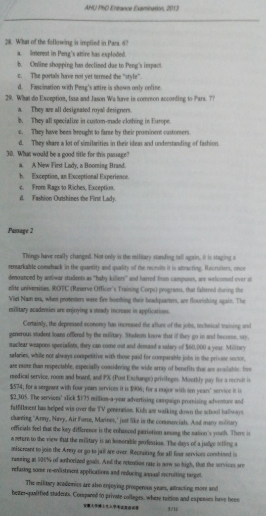 基础英语一.选择题(选择题有两部分)A考词汇的词意辨析,短语辨析(感觉都是重视词意,)题型类似三笔,难度也接近。B划线处替换(基本上是换句子)考语法,词意句子都不难,但是想做好很难,一些地方考的比较细二.阅读理解(4篇)第一篇是比较简单的阅读难度类似4级难度,说的是一对姐妹,具体的不记得了。题型是, ...
