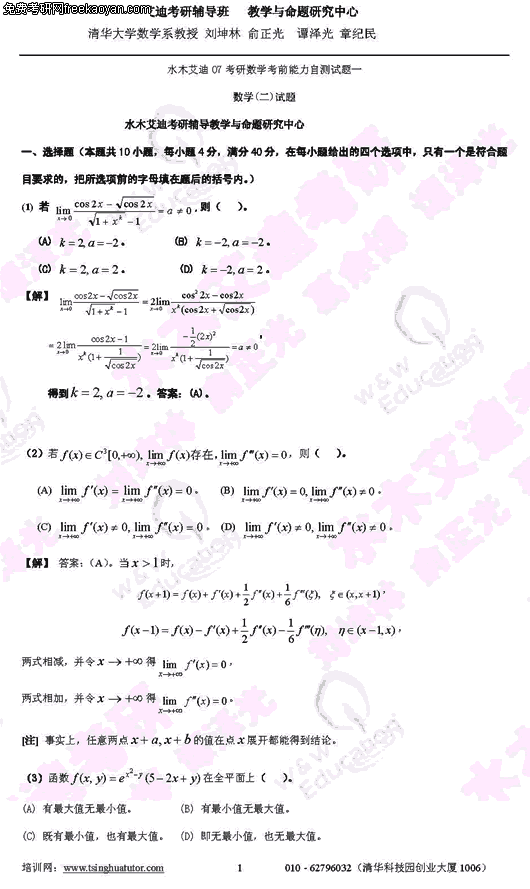 2007年半岛在线注册考前能力自测试题及答案(数学二)(8)