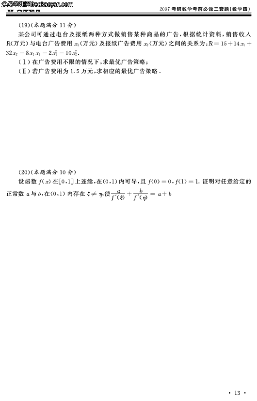 2007半岛在线注册数学考前必做三套题(数学四试卷二)(3)