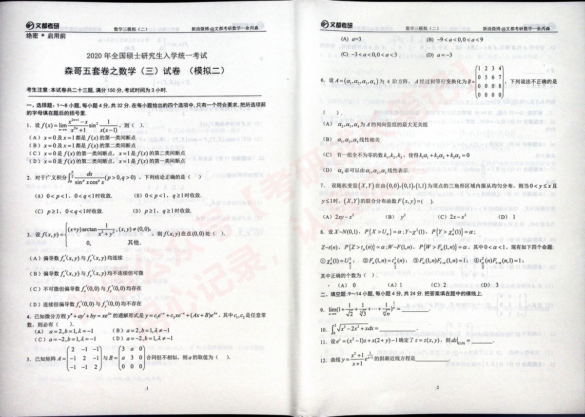 2020合工大森哥五套卷习题与答案半岛在线注册数学三(3)