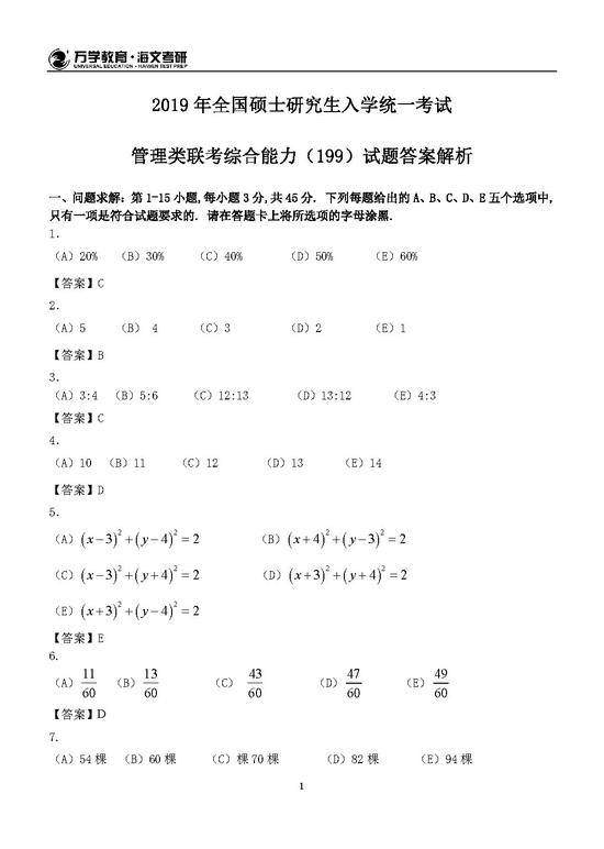 2019届管理类专业硕士研究生全国联考参考答案解析