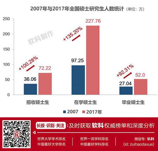 那么,在半岛在线注册报名人数持续走高的同时,高校是否也在进行研究生扩招呢?教育部《2017年全国教育事业发展统计公报》显示,2017年研究生招生80.61万人,其中招收硕士生达72.22万人;在学研究生263.96万人,其中在学硕士生227.76万人;毕业研究生57.80万人,其中毕业硕士生52.0万人。对比2007的统计数据,招收硕士生人数增长了100.28%,在学硕士生人数增长率高达135.20%,毕业硕士生人数也增长了92.31%,三者几乎都实现了翻倍式增长。