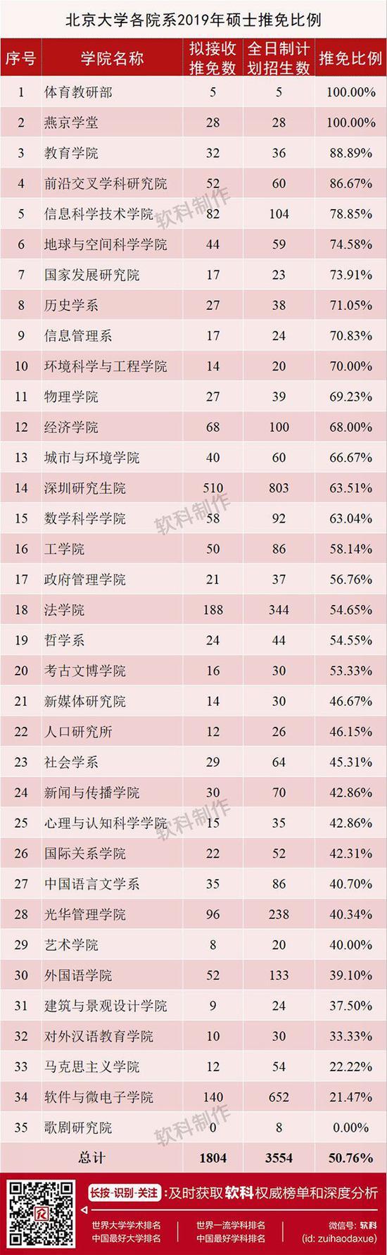 若具体到院系或专业,很多院系或专业的推免比例则要更高。以北京大学(分数线,专业设置)为例,体育教研部和燕京学堂的推免比例为100%。教育学院和前沿交叉学科研究院的推免比例分别为88.89%和86.67%。信息科学技术学院、地球与空间科学学院、国家发展研究院、历史学系等推免比例超过了70%。总体来看,北京大学的推免比例为50.76%,共有20个院系的推免比例超过了50%,其中不乏热门专业或北大的一流学科,这在无形中加大了统招考生的竞争激烈程度。