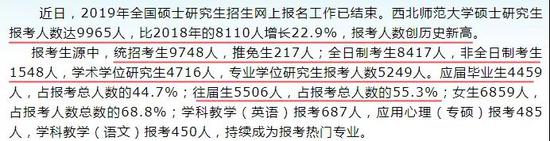 西北师范大学今年报考人数达到了9965人,其中统考认识有9748人,较去年增加了1855人,增幅达22.9%,创造了历史新高。