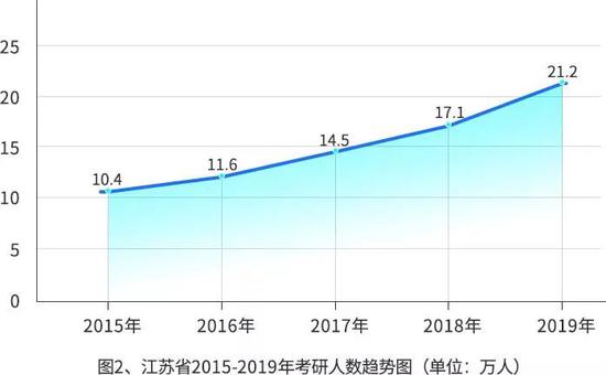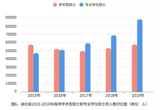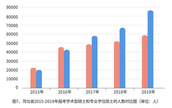 从上面两张图片中我们可以看到,2015年两省专业学位硕士报考人数与学术型硕士相比略少一些,2016年基本持平,从2017年到2019年,专业学位硕士的报考人数已经超过了学术型硕士。