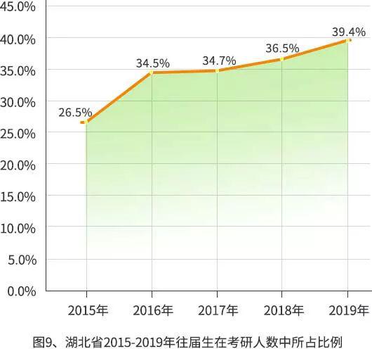 湖北省2015年往届生所占比例为26.5%,到2019年所占比例升至39.4%: