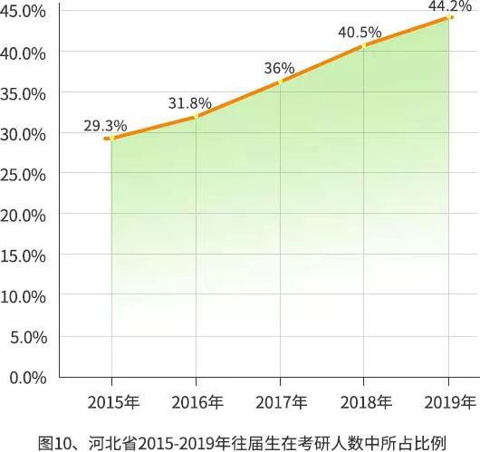 河北省2015年往届生所占比例为29.3%,到2019年这个比例升至44.2%: