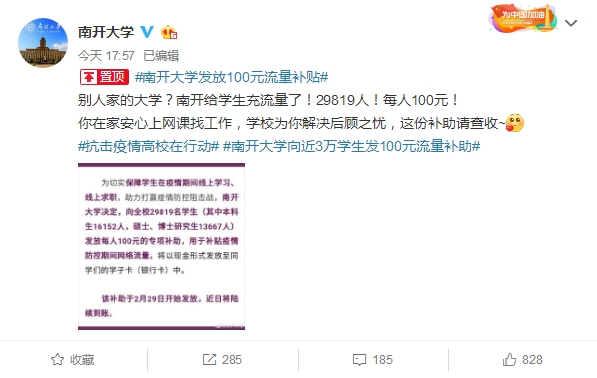 为保障学生疫情期线上学习、线上求职,南开大学(分数线,专业设置)决定以现金形式,向全校29819名学生银行卡发放每人100元专项补助,用于补贴疫情防控期间网络流量。