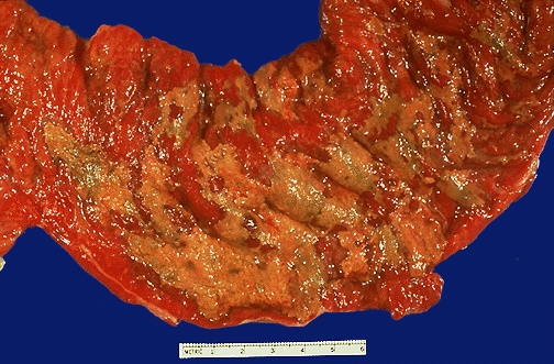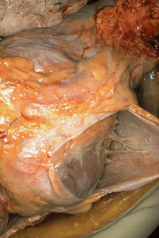 心脏标本,心包已剪开,见心包膜脏、壁两层有大量灰白色纤维素性渗出物附着,心脏表面呈绒毛状外观
