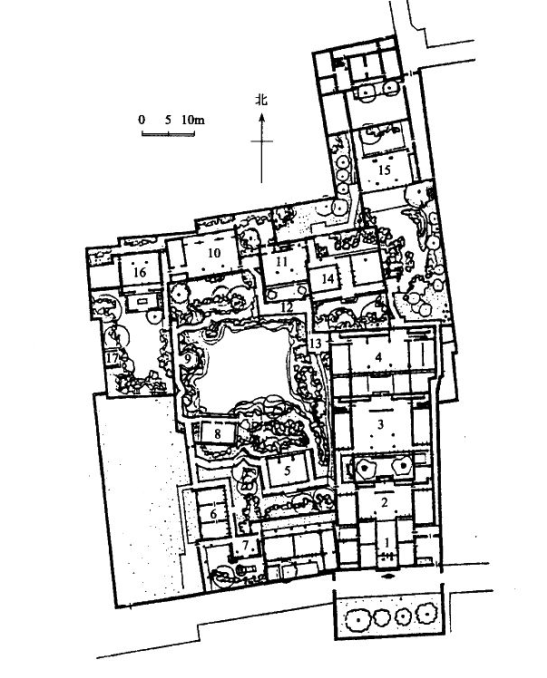 (4)南部为相对独立的“愉园”。愉园为一系列小庭院的复合体,以一座船厅为中心,厅左右的小天井内散置花木水池,成小巧精致的水局。(2分)
