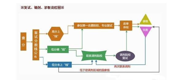 初试之后感觉自己发挥得不好,估分之后分数线有点玄的同学,除了准备复试的内容之外,更要早点了解调剂的信息,做好多重准备。以下是一张复试调剂流程图: