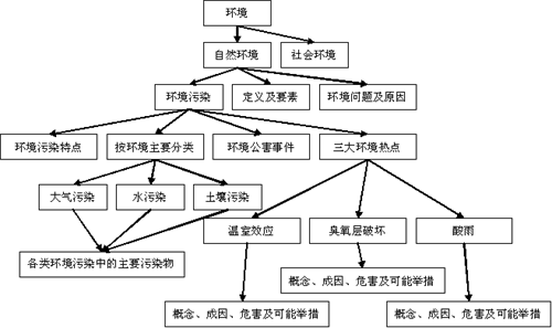 环境科学这一考试科目中共包括124个大纲知识点,如果考生一个一个去记忆、背诵,不仅费力,而且没有头绪容易忘记。如果建立知识框架体系之后再按照一定的思路记忆,则容易的多。学生复习时可以从环境扩展至自然环境与社会环境,这两点亦可以再一次进行扩展;自然环境扩展至定义及要素、环境问题及原因和环境污染;环境污染再次扩展至环境污染的特点、按照环境的分类、环境公害事件以及当今环境的热点问题;环境的热点问题即人们关心的温室效应、臭氧层破坏及酸雨,这些事件是如何发生的、原因及其危害,人类采取哪些相关的措施才能有效地降低它们的危害。当然上面框架图中的任何一点均可以再做扩展甚至详细化,再次不再详细说明。