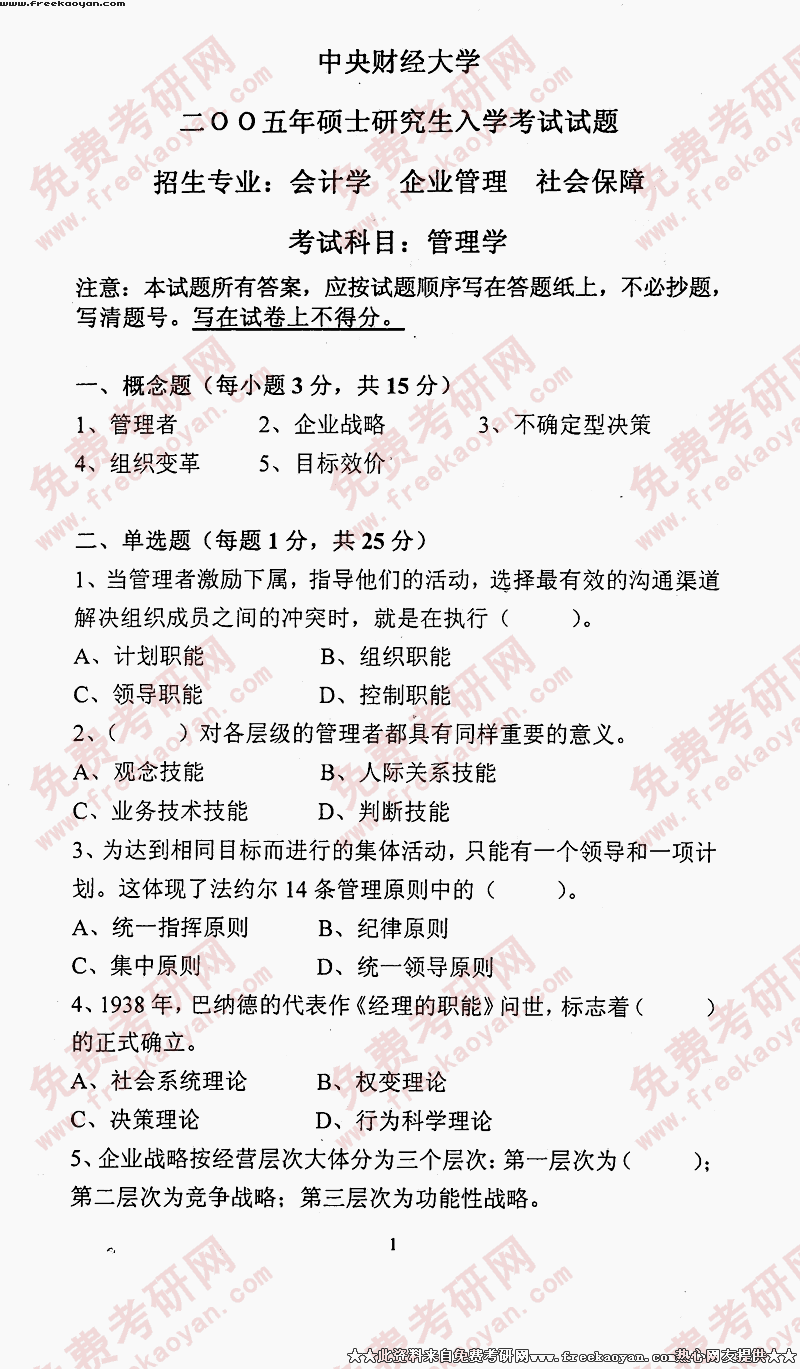 中央财经大学2005年硕士研究生入学考试管理学大纲点我下载管理学大纲 ...