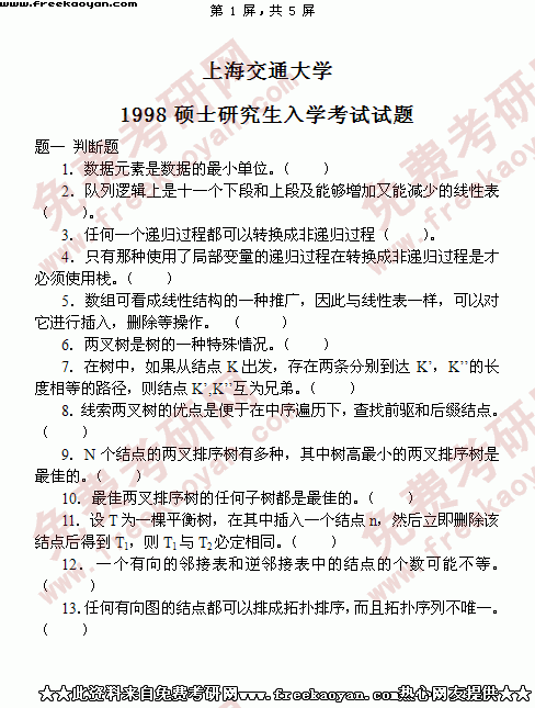 上海交通大学1998年半岛在线注册真题-数据结构