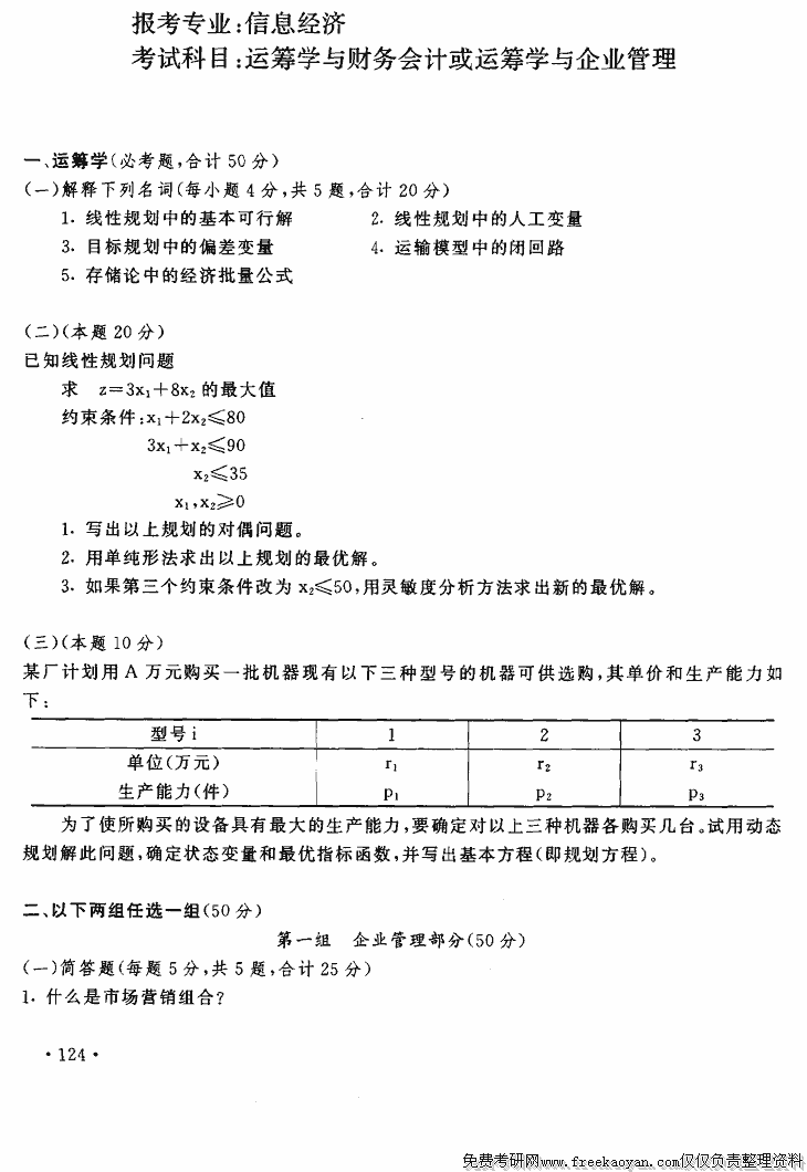 上海财经大学1995年半岛在线注册真题-运筹学与财务会计或运筹学与企业管理